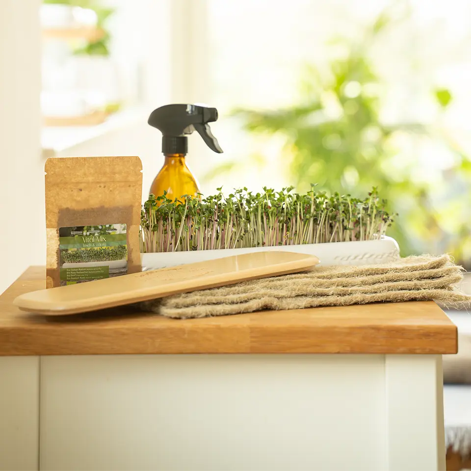 Mit unserer hochwertigen Anzuchtschale aus Keramik und mit Naturfaservlies (hier erhältlich) kann man wunderbar Microgreens anbauen. Sie ist genau dafür entwickelt und alle Bestandteile sind ideal aufeinander abgestimmt. Sie enthält spezielle Rillen im Boden, eine Holzabdeckung sorgt für den Wachstumsstart von Dunkelkeimer Samen und das Vlies speichert Wasser und sorgt für Belüftung und Halt der Wurzeln, damit die Samen gleichmäßig feucht bleiben und die Pflanzen ideal wachsen können. Hier wird nichts dem Zufall überlassen. Der mitgelieferte Pflanzensprüher sorgt für besonders feinen Sprühnebel, damit die Samen gleichmäßig befeuchtet werden können, ohne davon zu purzeln. Auch das Saatgut ist frisch und in Bioqualität, sodass wirklich viel keimt und eine üppige Ernte entstehen kann. Besonders toll ist, man braucht keine zusätzliche Pflanzenlampe, die am Strom hängt. Eine Fensterbank an einem sonnigen Fenster ist ideal. Es muss nicht mal Südseite sein und man braucht keine komplizierte Pflanzenlampe. Mach 2-3 Tagen fangen die Pflänzchen an, die Holzabdeckung anzuheben und wollen ans Licht. Jetzt kann man die Abdeckung abnehmen und nochmal Wasser von der Seite nachgießen. Das kann man bis Tag 5-7 wiederholen. Mehr Pflege brauchen Microgreens nicht. Nach etwa einer Woche kannst du ernten.